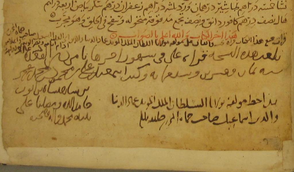 خط الملك المؤيد عماد الدين أبي الفداء إسماعيل بن علي بن محمود الأيوبي، صاحب حماة، مؤلف التاريخ المشهور “المختصر في أخبار البشر” وغيره، المتوفى عام ٧٣٢هـ.