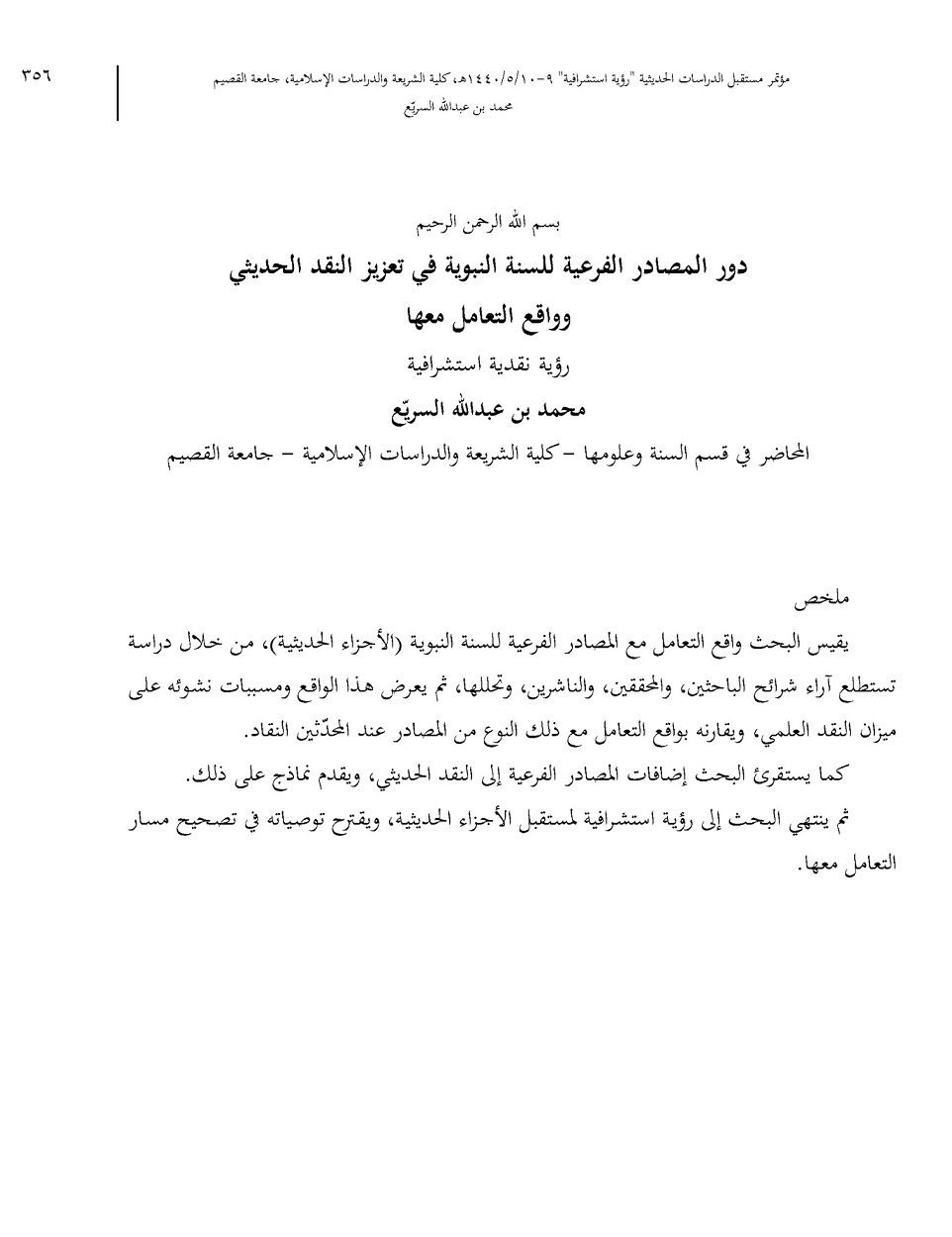 بحث محكم في مؤتمر (مستقبل الدراسات الحديثية): جامعة القصيم (1440هـ).