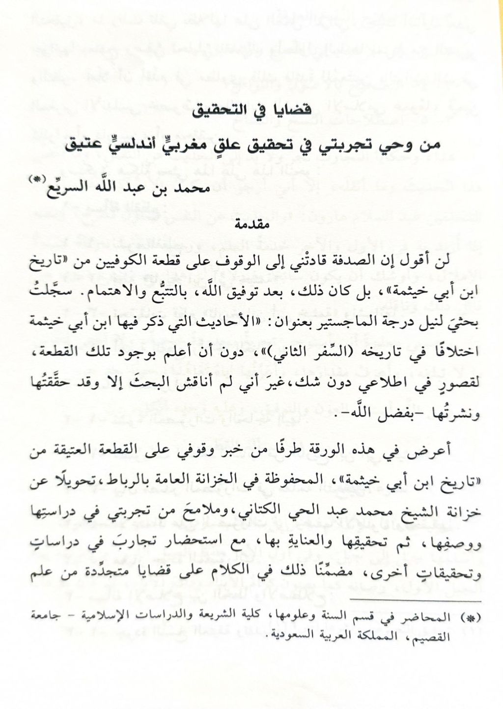 قضايا في أصول تحقيق المخطوطات، مستنبطة من تجربة تحقيق قطعة الكوفيين من (تاريخ ابن أبي خيثمة). تنتظم هذه القضايا في ثلاثة محاور: القِطَع، المصوَّرات، إصلاح الأخطاء.