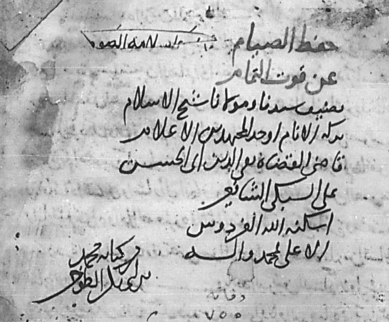 ومن منسوخاته: نسخة تقع في 8 ورقات من رسالة: “حفظ الصيام عن فوت التمام“، للعلامة تقي الدين السبكي (ت 756هـ)، التي ألَّفها عقب محاورةٍ علميةٍ مع بعض أهل العلم حول انتقاص الصوم بما يقارفه الصائم من معاصٍ كشتمٍ وغيبة، وأثر توبته منها في رفع ذلك النقص.
