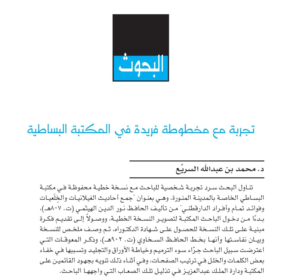 سرد تجربة شخصية مع نسخة محفوظة في مكتبة البساطي الخاصة بالمدينة المنورة، وهي مخطوطة: “جمع أحاديث الغيلانيات والخلعيات وفوائد تمام وأفراد الدارقطني” للحافظ الهيثمي، من خلال خبر الوصول إلى النسخة، ثم وصفها، وبيان المعوقات التي اعترضت العمل عليها من جهات الترميم والخياطة والتجليد.