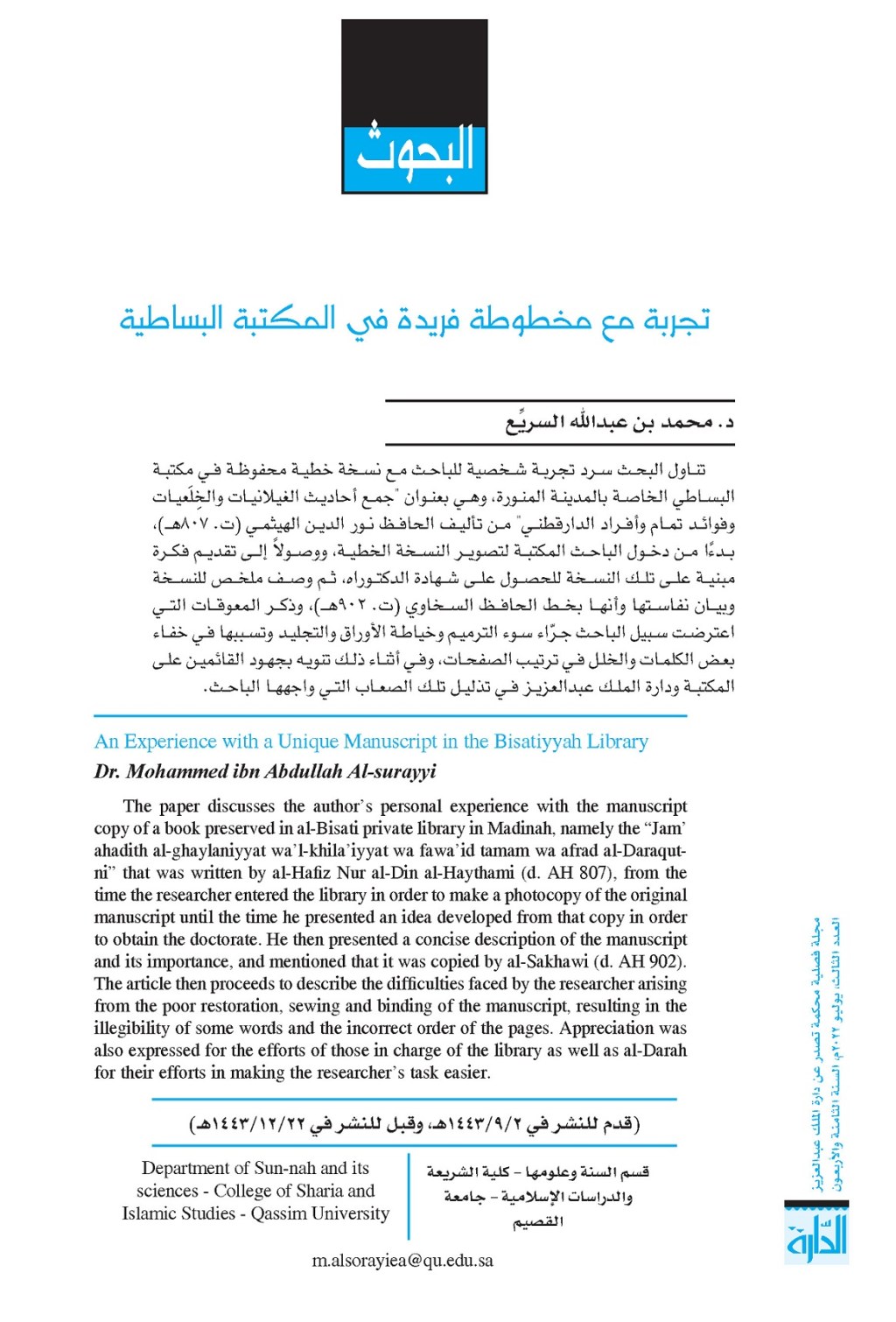 بحث محكم في مجلة الدارة (دارة الملك عبدالعزيز)، السنة 48، العدد 3 (يوليو 2022م).