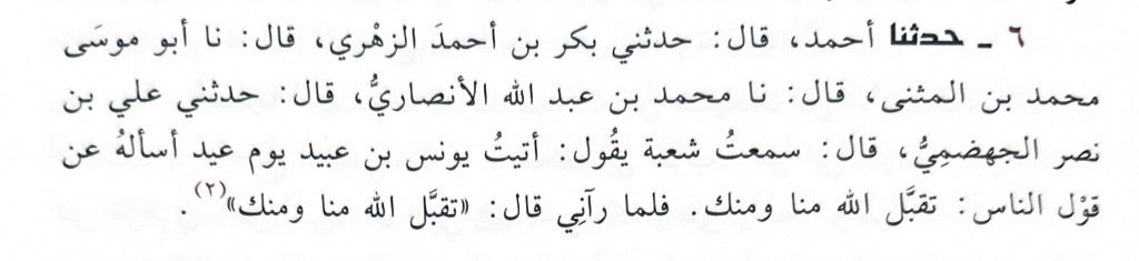 والأثر عند المحاملي في ثاني «صلاة العيدين» (150)، والطبراني في «الدعاء» (929)، من طريق شعبة، بسياقتين ليس فيهما حكاية شعبة، وقصدُه سؤالَ يونس يوم عيد، وما وقع له من الاتفاق، وإنما في إحداهما أن شعبة بادره بالدعاء فأجابه يونس بمثله، والأخرى مختصرة بذكر دعاء يونس فقط.