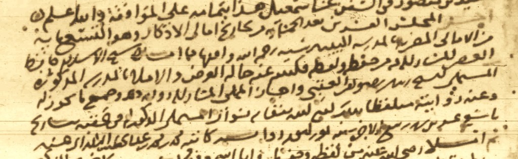 آخر المجلس العشرين بعد الخمسمائة من تخاريج أمالي الأذكار، وهو التسعمائة من الأمالي المصرية بالمدرسة البيبرسية -رحم الله واقفها-، مما أملاه شيخ الإسلام حافظ العصر المشار إليه فيه من حفظه ولفظه، فكتبته عنه حالة العرض والإملاء بالمدرسة المذكورة. المستملي: الشيخ زين الدين رضوان العقبي. وأجاز المملي المشار إليه رواية ذلك وجميع ما يجوز له وعنه روايته، متلفظًا بذلك -أمتع الله ببقائه-، بسؤال المستملي المذكور له في عَقبه، بتاريخ تاسع عشرين شهر ربيع الآخرة[17]، سنة تسع وأربعين وثمانمائة. رواية كاتبه محمد بن محمد بن علي الخطيب اليلداني عنه.