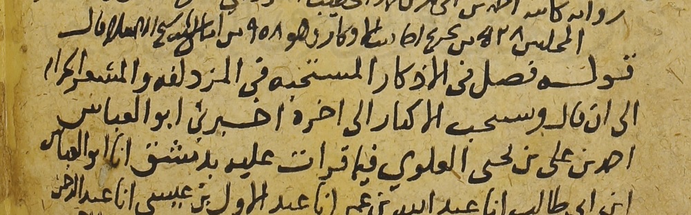 أخبرني أبو العباس أحمدُ بنُ علي بن يحيى العلوي -فيما قرأت عَليه بِدمشق-، قال: أنا أبو العباسِ بنُ أبي طالب، قال: أنا عبْدُالله بن عُمَرَ، قال: أنا عبدُالأوَّل بن عيسى، قال: أنا عبْدُالرحمن بن محمد، قال: أنا عبْدُالله بنُ أحمد، قال: أنا عيسى بنُ عمر، قال: أنا (عبد)[4] الله بنُ عبدالرحمن[5]، قال: أنا إسماعيل بن أبان. ح