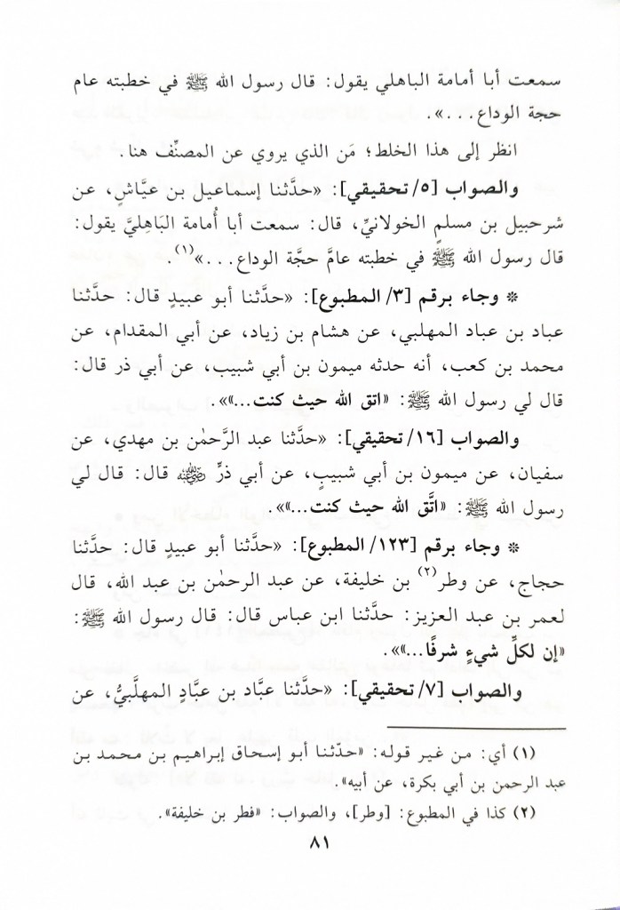 هذا، وقد أطال المحقق نفَسَه في دراسة الأحاديث وتخريجها جدًّا حتى خرج عن مقصود تحقيق الكتاب، ووددتُ أن لو اختصر المحقق -وفقه الله- حواشيَه وتخريجاتِه، أو جعلها في كتابٍ مستقل، وأن لو عُني بسماعات النسخة المقدسية ودراستها بعضَ عنايته بالتخريج، وأن لو اجتهد في إعادة ترتيب النسخة الألمانية، وأن لو ظهرت آثار مقابلته بها، فإن فروق النسخ نادرة في التحقيق أو معدومة، حتى في مواضعَ أشار المحقق نفسُه في وصف النسختين إلى تبايُنهما فيها، هذا مع وقوفه على النسخة الألمانية جزمًا.