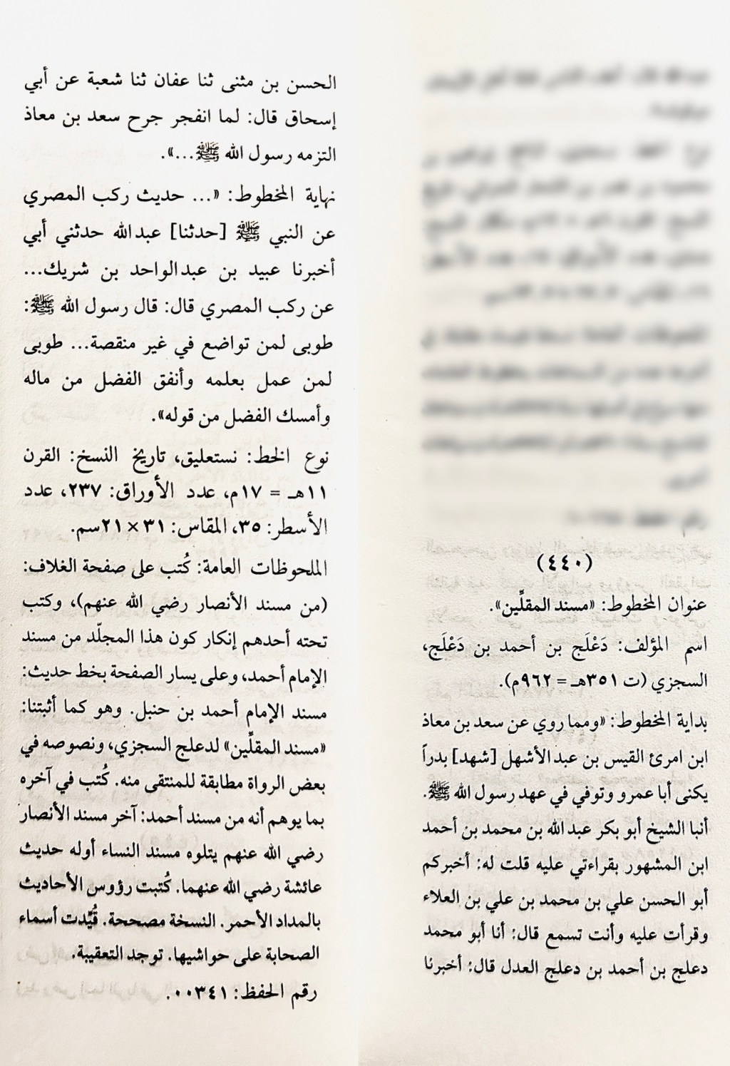وبرفقه بيانات الفهرسة من «فهرس الحديث النبوي الشريف وعلومه» الصادر حديثًا (1445هـ) ضمن «فهارس المخطوطات الأصلية المحفوظة في مركز الملك فيصل للبحوث والدراسات الإسلامية»، إعداد الشيخ البحَّاثة: عمار تمالت.