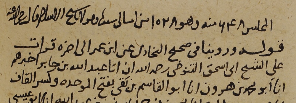 قرأت على الشيخ أبي إسحاق التنوخي -رحمه الله-، أن أبا عبدالله بن جابر أخبرهم، أنا أبو محمد بن هارون، أنا أبو القاسم بن بَقي -بفتح الموحدة وكسر القاف-، أنا محمد بن عبدالحق، أنا محمد بن فرج، أنا يونس بن عبدالله، أنا أبو عيسى بن يحيى الليثي، عن [2] أبيه، عن يحيى بن يحيى الليثي، عن مالك[3]. ح