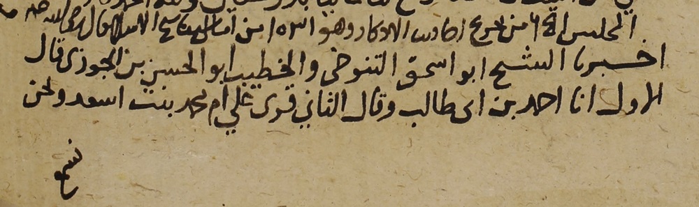 أخبرنا الشيخ أبو إسحاق التنوخي والخطيب أبو الحسن بن الجوزي، قال الأول: أنا أحمد بن أبي طالب، وقال الثاني: قرئ على أم محمد بنت أسعد -ونحن [2/65ب] نسمع-، قالا: أنا أبو عبدالله الزَّبيدي، أنا أبو الوقت، أنا أبو الحسن بن المظفر، أنا أبو محمد بن أعين، أنا أبو عبدالله الفربري، أنا أبو عبدالله البخاري[2]. ح