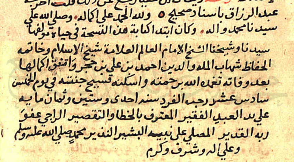 • نسخة من «التلخيص الحبير» للحافظ ابن حجر العسقلاني (ت 852هـ)، ختمها ناسخها بقوله: «وكان ابتداء كتابة هذه النسخة في حياة مؤلفها سيدنا وشيخنا الشيخ الإمام العالم العلامة شيخ الإسلام وخاتمة الحفاظ شهاب الملة والدين أحمد بن علي بن حجر. واتفق إكمالها بعد وفاته -تغمده الله برحمته، وأسكنه فسيح جنته- في يوم الخميس، سادس عشر رجب الفرد، سنة إحدى وستين وثمانمائة…».