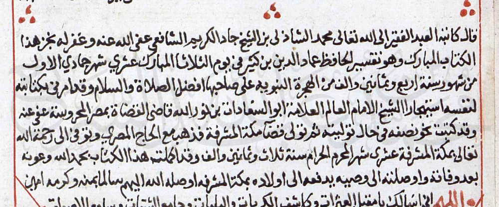 • نسخة من «تفسير ابن كثير»، قال ناسخها محمد الشاذلي بن جاد الكريم الشافعي في آخرها: «وقد أمرني بكتابته لنفسه استئجارًا: الشيخ الإمام العالم العلامة أبو السعادات بن نور الله، قاضي القضاة بمصر المحروسة -عفي عنه-، وقد كتبت نحو نصفه في حال توليته، ثم تولى قضاء مكة المشرفة، فذهب مع الحاج المصري، وتوفي إلى رحمة الله -تعالى- بمكة المشرفة عشري شهر المحرم الحرام، سنة ثلاث وثمانين وألف، وقد أكملت هذا الكتاب -بحمد الله وعونه- بعد وفاته، وأوصلته إلى وصيه يدفعه إلى أولاده بمكة المشرفة…».