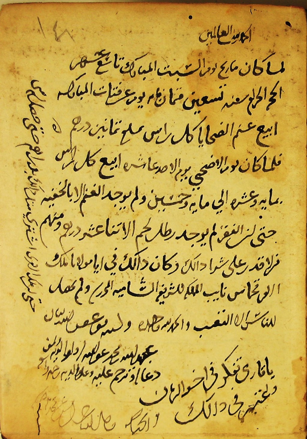 وثيقة ملحقة بمخطوط تاريخي، يشرح فيها كاتبها أزمة وجود الأضاحي وأسعارها في الشام، في يومي عرفة والأضحى من عام 890هـ.