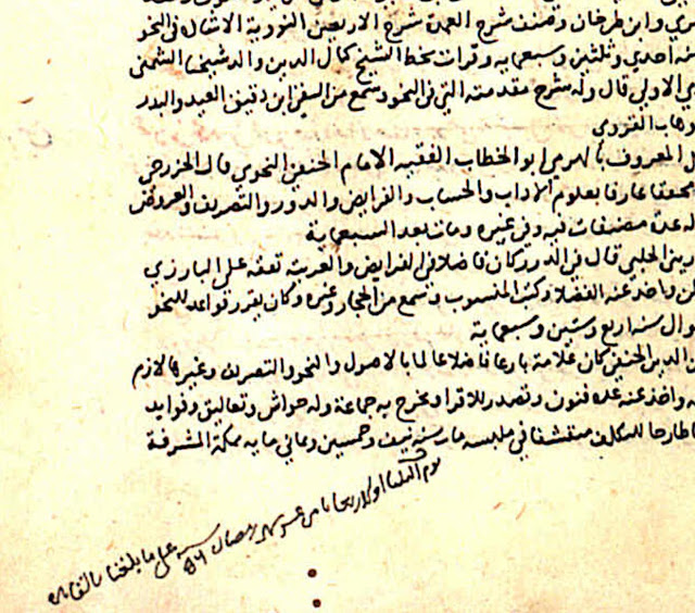 – وأن البقاعيَّ الذي كان يكبر السيوطي بأربعين سنة، وكان يومئذٍ في الخامسة والستين من عمره (قبل وفاته بـ11 سنة)، قد قرأ تأليف هذا الشاب، وكتب عليه، ودعا لمؤلفه بالنفع، ولقَّبه بلقبه، والظاهر أن السيوطيَّ كان في التبريز والتميز بالقدر الذي يتطلَّع معه مَن لقيه أو قرأ له إلى مستقبله العلمي الباهر.